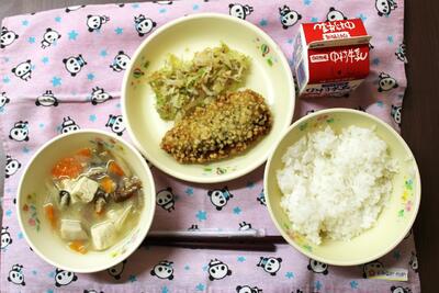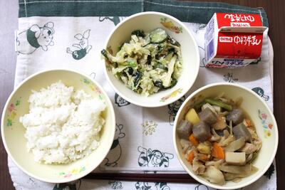 今日の献立は、ごはん・団子汁・ちくわの磯辺揚げ・ゆできゅうりです。