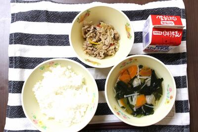 今日の献立は、ごぼう団子汁・豚肉のしょうが焼きです。