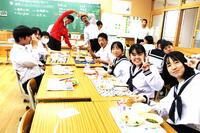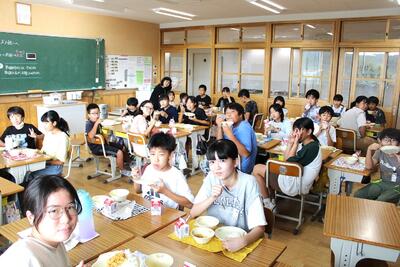 今日は、遠足(1~4年)や宿泊学習(5年)で、6~9年生のみの給食でした。いつもより作る量が少ない分、「ちくわの磯辺揚げ」は、時間や手間のかかる手作りだそうです。