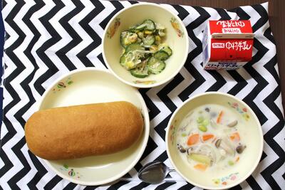 今日の献立は、コッペパン・きのこのクリームシチュー・野菜のドレッシング和えです。
