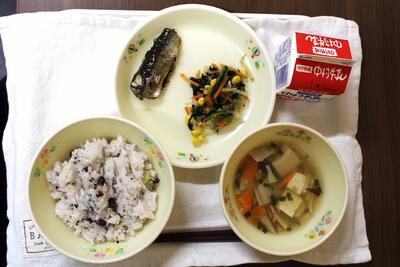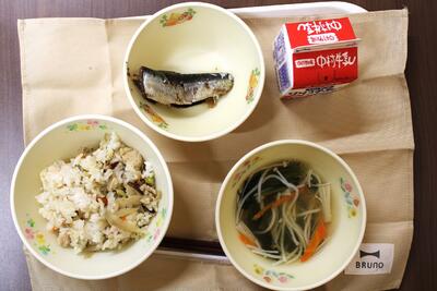 今日の献立は、芋おこわ・五目豆腐汁・いわし生姜煮・カラフルおひたしです。