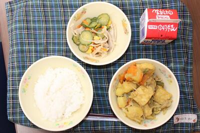 今日の献立は、ごはん・カレー肉じゃが・五色和えです。