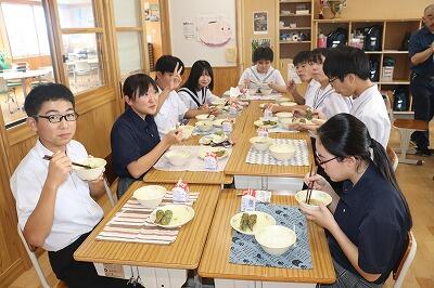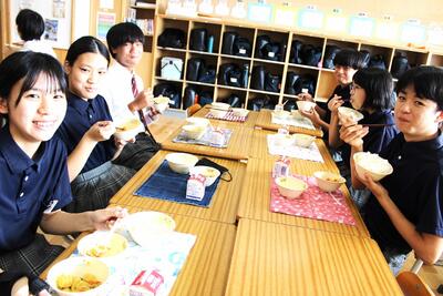 「芋おこわ」は、いつもの木城米と、もち米を同じ量ずつ使い、木城産のさつま芋と小豆も入れて作られているそうです。もち米は、木城学園の5年生が田植えなどにかかわったものを無償提供していただきました。5年生の皆さん、JA青年部の皆さん、美味しいもち米を育ててくれてありがとうございます。