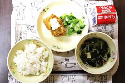 今日の献立は、麦ご飯・豆腐のすまし汁・チキン南蛮・ゆでブロッコリーです。