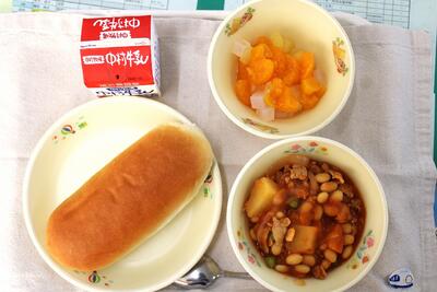 今日の献立は、ミルクパン・ポークビーンズ・フルーツナタデココです。