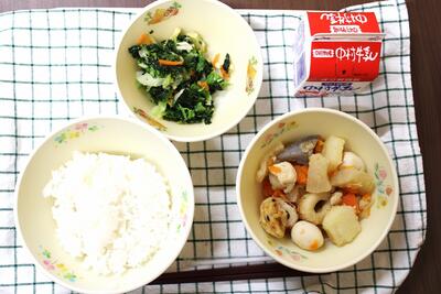 今日の給食は、牛乳、ごはん、山里汁、魚の照り焼き、塩昆布和えでした。