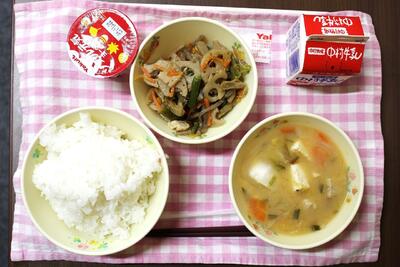 今日の献立は、麦ご飯・たらのキムチ汁・きんぴられんこん・ヨーグルトです。
