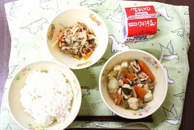 今日の献立は、ごはん・すき焼き風煮・ピーナッツなますです。