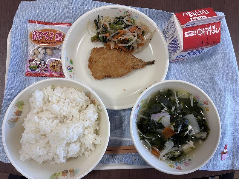 今日の給食は、牛乳、ごはん、たこボールのすまし汁、いわしフライ、ごま和え、節分豆でした。今日は節分なのでいわしが出ました。節分には豆をまく以外にも、いわしを食べる風習があります。なぜ「いわし」かというと、昔の風習で、鬼が家に入ってこないように、いわしの頭を飾っていたからだと言われていまいわしを焼いた煙のにおいで鬼を追い払ったと言われています。今日はフライにされていて、パン粉に包まれたいわしがジューシーで美味しかったです。節分と言えば、最近は恵方巻を食べることも風習になっていますが、皆さんはどのようなものを食べて節分をお過ごしでしょうか。