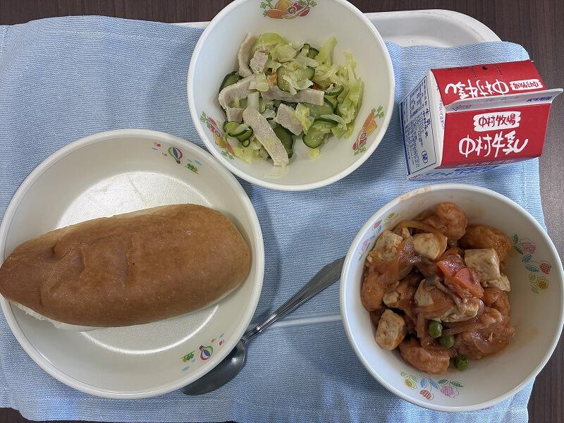 今日の給食は、牛乳、米粉パン、えびと豆腐のチリソース、ハムサラダでした。米粉パンは通常のパンよりも、もちもちしていて噛み応えがあります。えびと豆腐のチリソースならごはんの方が合うのでは?と思う方もいらっしゃるかもしれませんが、米粉パンにぴったりマッチして美味しいです。パンというと西洋風なおかずの方が合うと思われるかもしれませんが、米粉パンのもっちり感が中華風のおかずも受け止めてくれます。