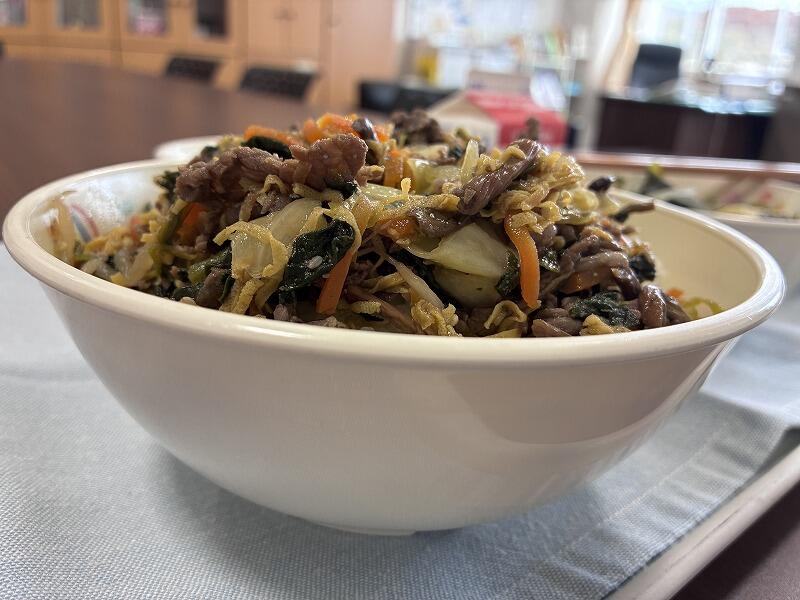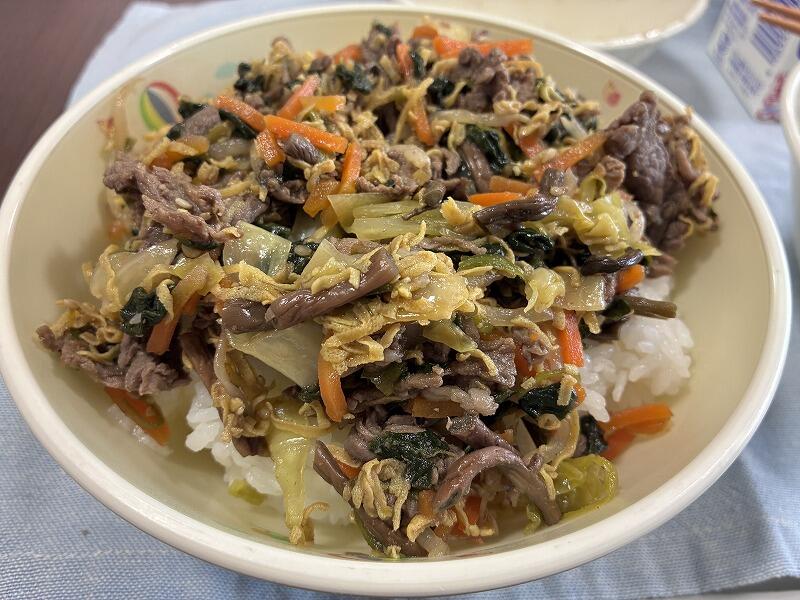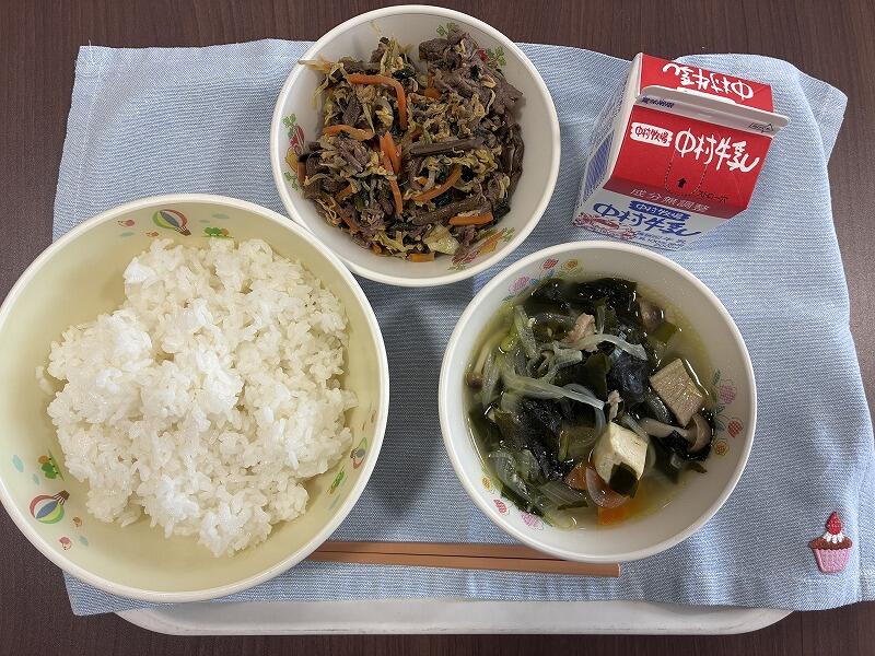 今日の給食は、牛乳、ごはん、ビビンバ丼の具、わかめスープでした。ビビンバ丼も人気メニューの一つです。野菜がたくさん入っているので、野菜が苦手な子どもでも、無理なく野菜を食べることができるメニューです。また、丼物は、ごはんも一緒に食べるのでさらに食が進むことでしょう。わかめスープも豆腐とベーコンとわかめとたくさんの野菜が入っていてボリューム満点でした。