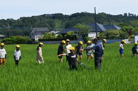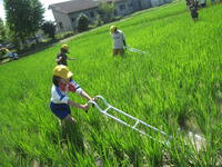 今回は、さらに稲を成長させるために、稲と稲の間にある雑草を「田車」という機械を使って根を切っていきました。「押して、引く」というかけ声で、機械を上手に使い、一生懸命活動することができました。子どもたちは、今後の活動も楽しみにしています。