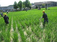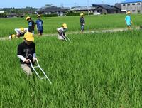 キータイム(総合的な学習の時間)の「お米大研究」の学習の一環として、JAとJA青年部の方々のお力添えをいただき、田んぼの草取りを行いました。4月に植えた苗も、子どもたちの膝の高さまで成長しており、その成長を見て喜んでいました。