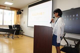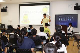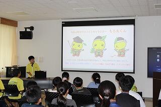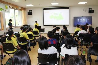 学園での交流は、まず毛呂山町の子どもたちが1人1人毛呂山町の紹介をしました。特産品やキャラクター、行事等について分かりやすく説明しました。途中でクイズを取り入れる子どももいて、内容が工夫されていました。