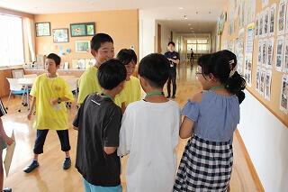 最後に、校内ウォークラリーをしました。25分の時間で、校内に設けた10箇所のクイズを探し、クイズに解答します。全て三択問題でした。それだけでなく、至るところに木城町のマスコットがおかれていて、それを回収します。そのキャラクターの中には数字が書いている者があり、それがボーナスポイントとして加算されます。A~Dの4班で行いました。1階から3階まであらゆる所を楽しそうに探していました。