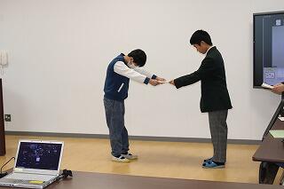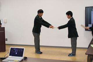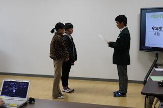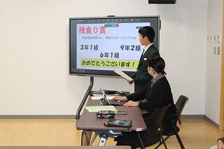 次に、残食0賞、ペロリ賞授与がありました。どちらの賞も12月1日~5日、12月15日~19日を残食調査期間として調べました。残食0賞とは、調査期間中に各クラスの残食を記録し、残暑の無かったクラスに賞状を授与するものです。「3年1組」「6年1組」「9年2組」が受賞しました。ペロリ賞とは、食缶や食器がきれいな状態になっているかを給食専門委員長と副委員長でチェックし、残食量と食缶や食器のきれいさで点数をつけたものです。第1位「3年生」第2位「9年生」第3位「6年生」が受賞しました。