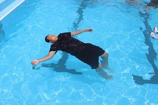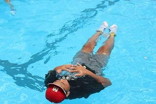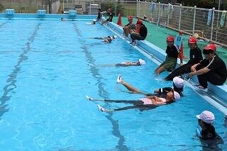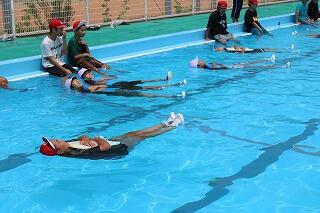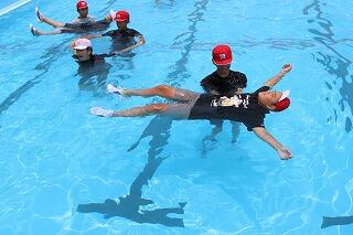 最後に、何も無しで浮く練習を行いました。これまでの練習を活かしてすぐにできる学園生も見られましたが、なかなか上手にできない学園生も見られました。やはり、力が入って顔が上を向いていないので、体が浮くことができません。そこで、2人組をつくり、1人が手で支えるところから始めました。上手にできる学園生のポイントを伝えると、徐々にできるようになっていきました。