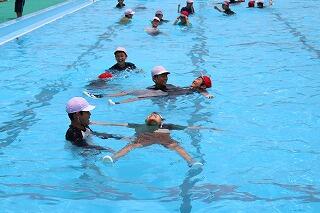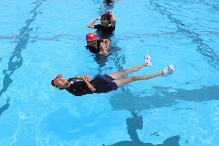 まず、服を着ていつも通りに水に入り泳ぎました。ほとんどの学園生は、いつもより泳ぎにくいと話していました。服が体にぴたりとくっついたり、空気が入ったりして泳ぎにくかったと思います。それでも、一生懸命泳いでいました。しかし、これでは、なかなか進まないので体力がもたないことが分かりました。