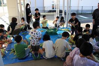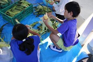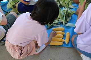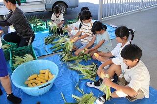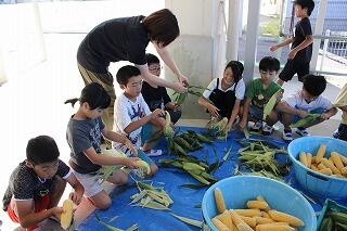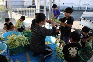 実は、3年生。登校してすぐに、給食調理場の横で、「木城産とうもろこし」の皮むきを頑張ってくれたのです。1人5本ずつ頑張りました!最初は、なかなか上手くいきませんでしたが、給食センターの先生やとうもろこしを納入していただいた保護者の方から教えていただき、最後は上手に出来るようになりました。緑の皮をむいた後、中から真っ黄色の粒がみえてくると、「きれい!」「おいしそう!」という声があちらこちらから聞こえてきました。ですから、きっと私たちが感じた甘みの数倍美味しく感じたことと思います!