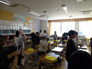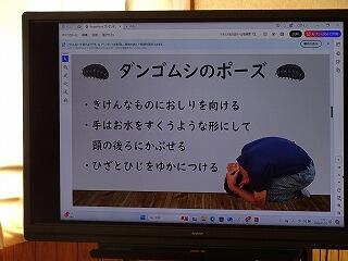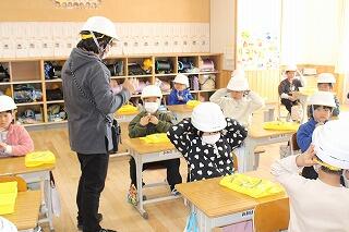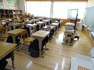まず、各教室で「サルのポーズ」「ダンゴムシのポーズ」を確認しました。机の下に隠れるときのポーズです。