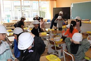 次に、木城町から寄贈されている「防災ヘルメット」を着用しました。4月以来だったので、始めはとまどっていた学園生もいましたが、何度かやっている内に上手になりました。