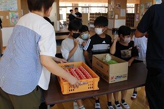 給食内容は、「防災おにぎり」「救急根菜汁」「米粉ドッグ」「牛乳」でした。いつもは給食コンテナ室に行きますが、全学年交流ホールに取りにきました。実際の避難所である炊き出しをイメージしました。