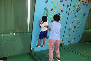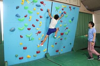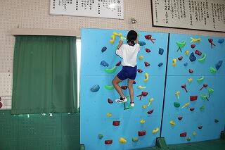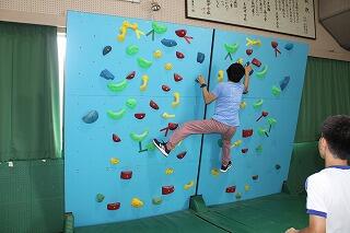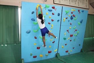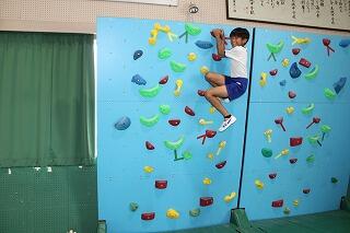 「ボルタリング」は本校職員「藤井 昭子」教諭が行いました。実は藤井教諭もすごいんです。「クライミング」の世界選手権に出場したことがあるんです。すごいですよね!藤井教諭の指導の下、学園生は体育館の2階に常設しているボルタリングで活動を行いました。手がすべらないように手に白い粉を付け、壁に向かいます。始めはとまどっていた学園生もいましたが、どんどん慣れてきて上手になっていきました。やっぱり子どもってすごいです!