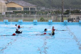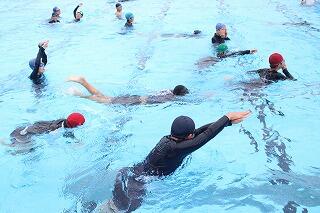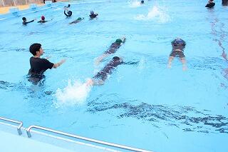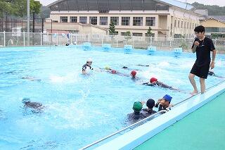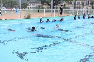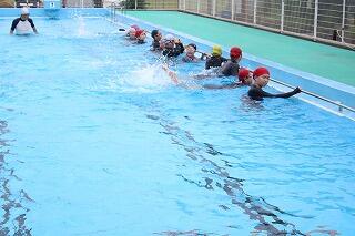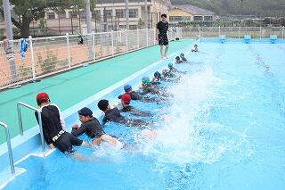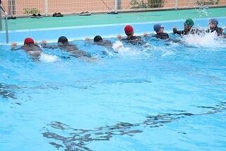 私が取材したのは、6年生でした。水慣れのあと、「バタ足練習、けのび、泳ぐ」という学習を行いました。今年度初めての授業だったので、個人差がありました。夏休みまでには、たくさんの学園生の泳力が付くように指導していきます。