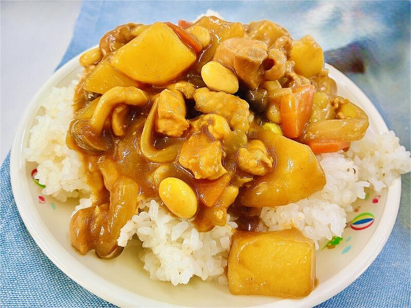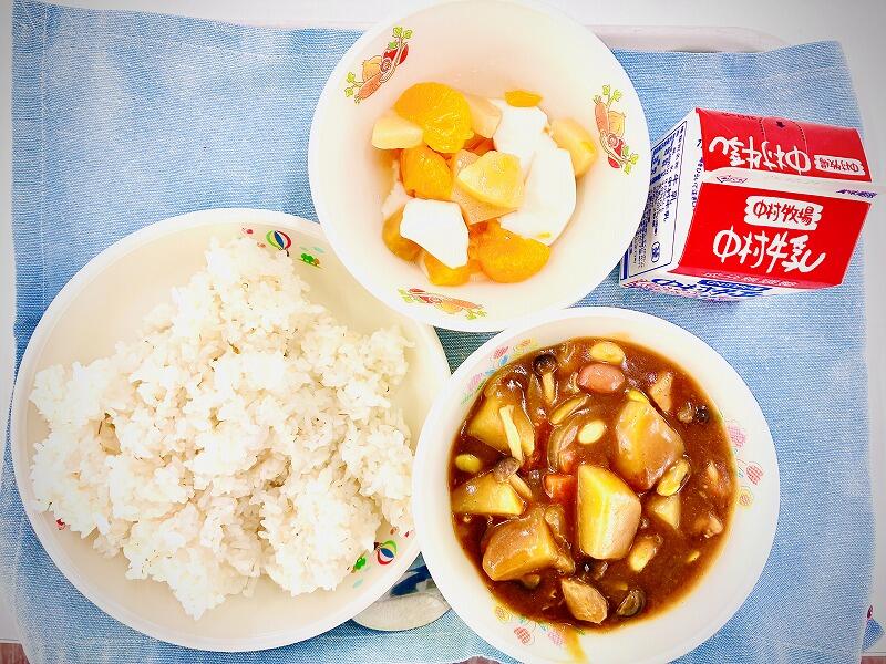 今日の給食は、牛乳、麦ごはん、チキンカレー、フルーツ杏仁豆腐でした。写真でも分かる通り、豆が入っています。ミックスビーンズです。カレーにマッチしていてとても食べやすいです。豆が苦手なお子さんでも食べやすい調理方法だと思います。チリコンカンのようなメキシコの料理では豆がふんだんに使われていることなどからも、豆とスパイシーな料理との相性はよいと思われます。また、本校ではキーマカレーにひきわりの豆を使ったりもしています。興味を持たれた方は、ぜひ試してみてください。