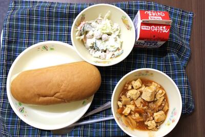 今日の献立は、コッペパン・豆腐のチリソース煮・ひよこ豆のサラダです。