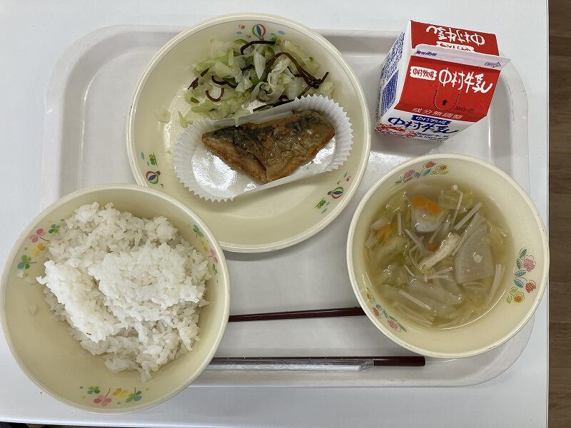 今日の給食は、牛乳、麦ごはん、サバの竜田揚げ、塩昆布和え、芋の子汁