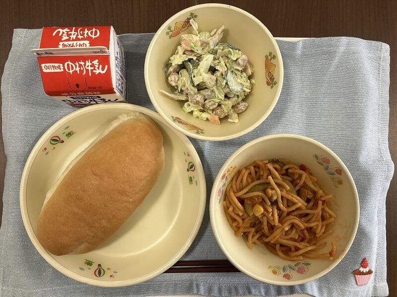 今日の給食は、牛乳、減量コッペパン、ズッキーニとトマトのスパゲッティ、ヒヨコ豆のサラダでした。