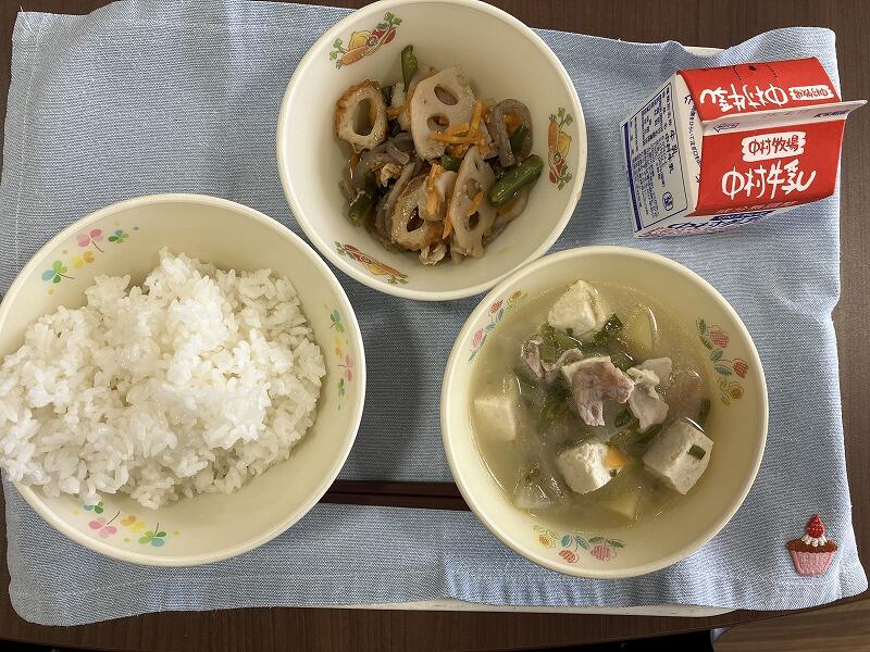 今日の給食は、牛乳、ごはん、豚汁、きんぴられんこんでした。