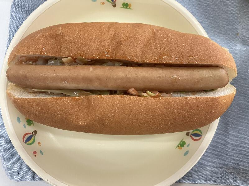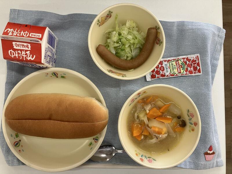 今日の給食は、牛乳、ドッグパン、ボイルウィンナー、キャベツ、一食ケチャップ、とり肉のスープ煮でした。ホットドッグをつくって食べました。