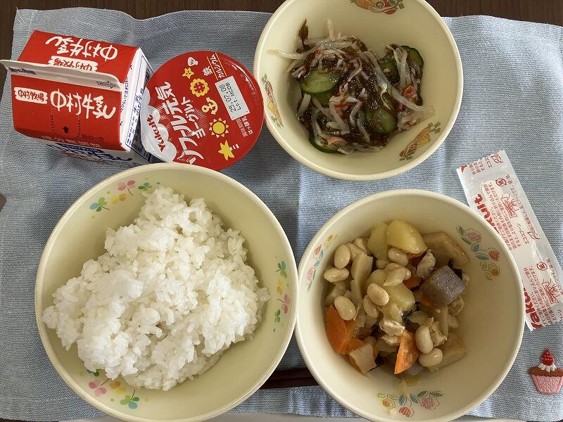 今日の給食は、牛乳、ごはん、五目煮、もずくの酢の物、ソフール元気ヨーグルトでした。