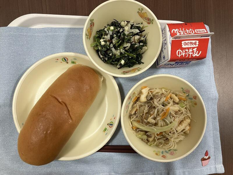 今日の給食は、牛乳、黒糖パン、炒めビーフン、鉄骨サラダでした。