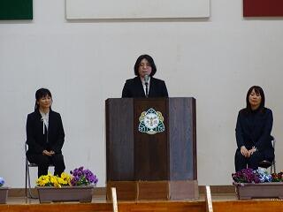 離任式には、6名の教職員が参加しました。入場する段階から、涙を流している職員もいました。それだけ、学園とのお別れがさみしいのです。入場が終わり、壇上で1人1人最後の挨拶をしました。全ての学園生が真剣に聞いていて、この1年間で大きく成長したことを感じることができました。