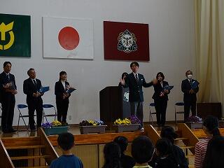 次に、今回より変わる新しい指揮者1名、伴奏者2名(式ごとに交互)が紹介され、校歌を歌いました。とても素晴らしい歌声で心がポカポカしました。