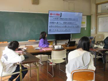 グループに分かれて、プロジェクト学習で調べた内容の中間発表を行いました。それぞれが、調べた内容を発表しながら、他の生徒から様々な質問を受け、本発表に備えます。それぞれの興味関心に応じてさまざまなタイトルがあり、興味をもって聞くことができました。