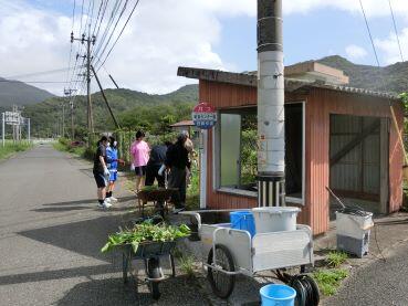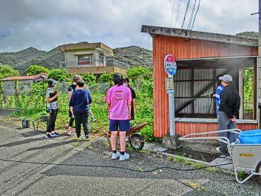 いよいよバス停のリノベーション活動が始まりました。内装・外装をする前に、バス停の周辺をきれいにしました。草を抜いたり、高圧洗浄機でコケや泥を取り除いたり、サッシをきれいにしたりしました。暑い中でしたが、協力して作業を進めることができました。