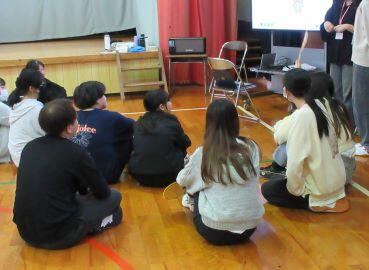 青朋高校について理解を深めることを目的に、青朋高校の通信制生徒会が本校を訪問し、熊野江教室の中学生と交流会を実施しました。高校生が主体的に動き「自己紹介ゲーム」「ジェスチャーゲーム」「大玉転がし」「大玉バレー」「学校紹介」を行ってくれました。中学生の感想では、「高校生がすごく優しくて楽しかった。」「高校生との交流は普段できないので、すごく楽しかった。すごく優しく接してくれてすぐに緊張がほぐれてすごく楽しかった。」「最初は緊張したけれど、みんな優しく接してくれたので最後はとても楽しむことができました。そして、貝殻キーホルダーを渡したとき、喜んでもらえてとても嬉しかったです。」「皆さんがとてもやさしくて、緊張したけど楽しく活動できました。来年もまた交流ができたらなと思います。」「みんな優しくて、青朋高校のことを知ることができてよかったです。」・・・