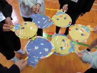 体育の時間は、ボールを使ったさまざまな運動をしました。大きなボールを友だち同士で投げ合ったり、目標に向かって投げ合ったりしました。2時間連続の体育でしたが、運動の楽しさを味わえる時間でした。