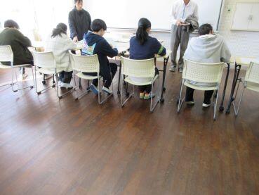 一斉授業では、このような形で授業が展開します。熊野江教室では、一人一人に応じた個別学習の時間にも力を入れていますが、生徒の実態に応じた一斉授業も実施します。各教科の特性を生かし、ゆっくりしたペースで生徒に合わせた一斉授業を展開します。この学校に来れば何かが分かる「学ぶ喜び」「わかる喜び」を大切にして授業を進めていきます。