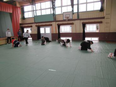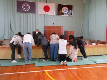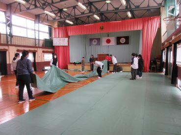 いよいよ学びの多様化学校分教室「熊野江教室」の第1回卒業式が近づいてきました。会場を小学生と一緒に使う関係で、小学生と一緒に会場にシートを引きました。小学生と協力して行えたので短時間で予定した準備を終えることができました。