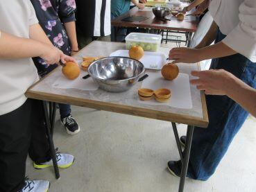 10月の参観日は、校外での参観です。これまで、取り組んできたキャリア教育のまとめの時間になります。これまでの取り組みをご家族の方々といっしょに体験活動を通してまとめました。これまでキャリア教育として取り組んできたのは、「ななめの関係の大人と語り合う(ひなたば)」「職場訪問・体験」「教えて世の中先生(田口さん)」そして、実際に田口さんから、「この農園にかける思い」や「今後の希望」、「これまでの苦労」、「自己選択と自己決定の大切さ」、「果物の値段は本当に高いのか?」について熱く語っていただきました。その後は、家族や友達と「なしタルト」「シャインマスカットタルト」づくりに挑戦し、試食しました。今回の活動には、「キャリア教育」の他にも、「10月から新しく加わった仲間の歓迎」「熊野江教室での日常の様子をご家族にも見ていただく」というねらいがありました。会場で講話・体験指導していただきました田口ファミリーファームの皆様方、大変お世話になりました。ねらいを十分達成できる活動ができました。ありがとうございました。