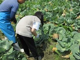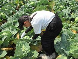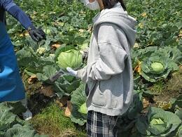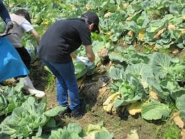 続いて、キャベツ包丁を使っての収穫の仕方のレクチャーを受けた後、一人ずつ収穫体験をしています。
