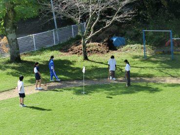 朝の時間に、在校生・職員の自己紹介をして、1日がスタートしました。合言葉は、「あせらずにゆっくり、自分のペースで」です。1時間目は、体育の授業です。2つのグループに分かれて、グラウンドゴルフを楽しみました。