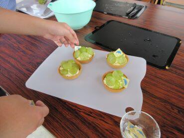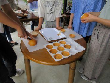 10月の参観日は、校外での参観です。これまで、取り組んできたキャリア教育のまとめの時間になります。これまでの取り組みをご家族の方々といっしょに体験活動を通してまとめました。これまでキャリア教育として取り組んできたのは、「ななめの関係の大人と語り合う(ひなたば)」「職場訪問・体験」「教えて世の中先生(田口さん)」そして、実際に田口さんから、「この農園にかける思い」や「今後の希望」、「これまでの苦労」、「自己選択と自己決定の大切さ」、「果物の値段は本当に高いのか?」について熱く語っていただきました。その後は、家族や友達と「なしタルト」「シャインマスカットタルト」づくりに挑戦し、試食しました。今回の活動には、「キャリア教育」の他にも、「10月から新しく加わった仲間の歓迎」「熊野江教室での日常の様子をご家族にも見ていただく」というねらいがありました。会場で講話・体験指導していただきました田口ファミリーファームの皆様方、大変お世話になりました。ねらいを十分達成できる活動ができました。ありがとうございました。