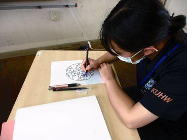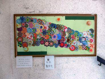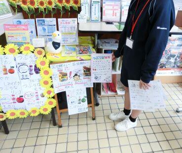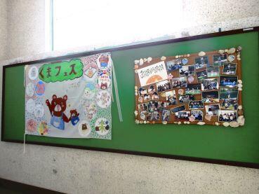 校内には、生徒手づくりの掲示物がいっぱいです。一人一人の丸い塗り絵を生かした「カラープロジェクト」。九州医療科学大学のインターンシップ生にも参加してもらいました。また、体育の授業で実施した「くまフェス」(ミニ体育大会)用登り旗も自分たちで作成しています。
