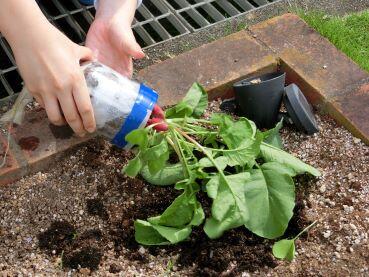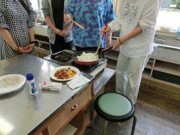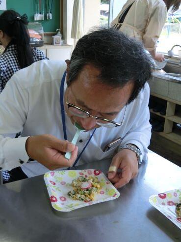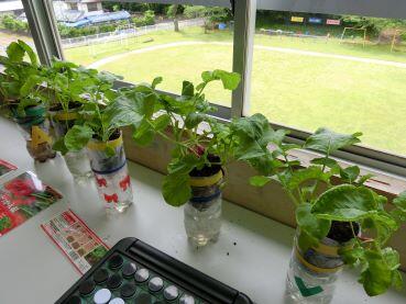 ペットボトル容器で育てた「ラディッシュ(二十日だいこん)」の収穫をしました。収穫したラディッシュの葉をチャーハンにしたり、実をサラダにしました。実を切る人、葉を湯がく人、卵とウインナー、ご飯を炒める人など、みんなで協力して楽しく調理できました。自分の育てた野菜は新鮮で、みんなでおいしくいただきました。校長先生にも食べていただきました。
